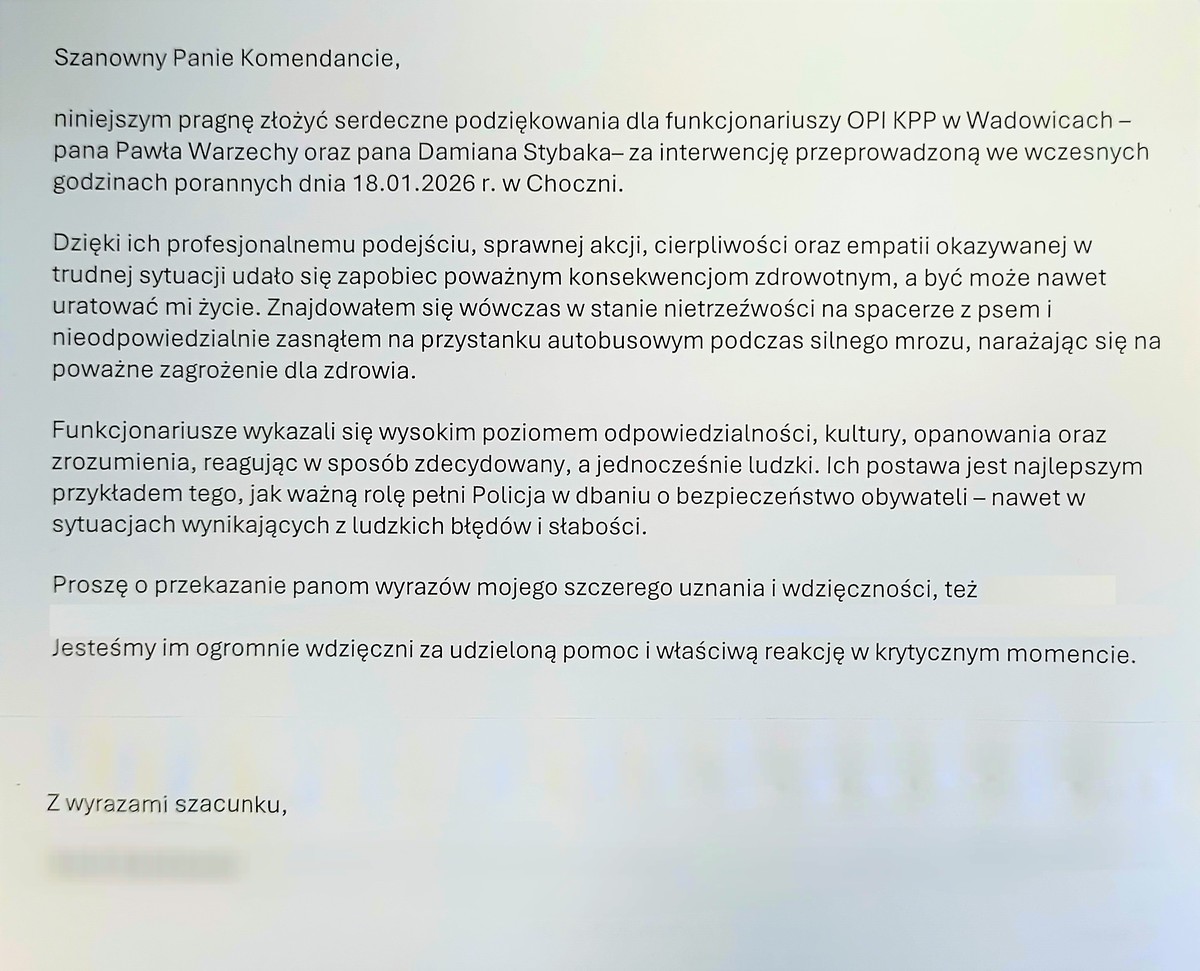 „Funkcjonariusze wykazali się wysokim poziomem odpowiedzialności, kultury, opanowania oraz zrozumienia, reagując w sposób zdecydowany, a jednocześnie ludzki…” – to fragment podziękowań dla policjantów z wadowickiej komendy od mieszkańca powiatu.